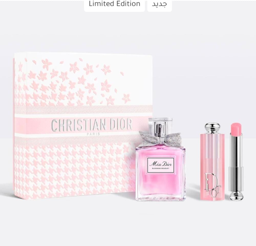 تُقدم Dior زجاجة بحجم 50 مل من Miss Dior Blooming Bouquet مع بلسم شفاه Dior Addict Lip Glow في مجموعة راقية ذات إصدار محدود. تتميز العبوة بنقشة هاوندستوث وردية اللون تتحول بعد ذلك إلى باقة من الأزهار والبتلات.